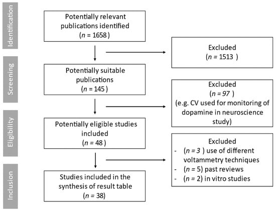 There were 1658 publications identified by the search strategy, and 38 studies were included in the synthesis of the data summary table. The selection process is outlined in the PRISMA flowchart (Figure 3). Notably, Kohen and colleagues from the Hebrew University (Israel) have published 27 studies in a broad range of disease settings and interventions from 1992 to 2018 [,,,,,,,,,,,,,,,,,,,,,,,,,,]. Two in vitro studies [,] and five retrospective studies reviews [,,,,] from this group are excluded from the synthesis of data summary table because they did not meet the inclusion criteria and to avoid duplication of information. Pohanka and colleagues from the Centre of Advanced Studies, University of Defence, (Hradec Králové, Czech Republic) published five studies from 2009 to 2011 [,,,,]. This group have also published three studies utilizing Square Wave Voltammetry (SWV) and Differential Pulse Voltammetry (DPV) [,,]. These techniques have not been included in this review, as they represent significant departures from the standard CV []. Mittal and colleagues from the University of Auckland, New Zealand published two studies examining CV in the context of acute pancreatitis and shock [,]. Four other research groups published the remaining four studies from Italy, the Czech Republic, France and India, respectively [,,,].