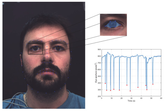 The eye aperture timeseries and the corresponding eye-related features (e.g., eye blinks, IBI, eye blinks duration) were extracted from facial videos. The facial videos had a sampling frequency of 30 fps. The pre-processing phase involved histogram equalization for contrast enhancement and face detection. The face detection was performed based on the Viola-Jones algorithm [14]. Active appearance models (AAM) [15] have been employed to estimate the 68 2-dimensional facial landmarks. In each eye, 6 landmarks were segmented tracking the perimeter of each eyeball. The 2D coordinates were used to compute the area enclosing these 6 landmarks according to Green’s theorem representing the eye aperture