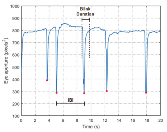 Time series of eye aperture and the identified blink peaks (denoted with red points). The IBI and the blink duration are also illustrated.