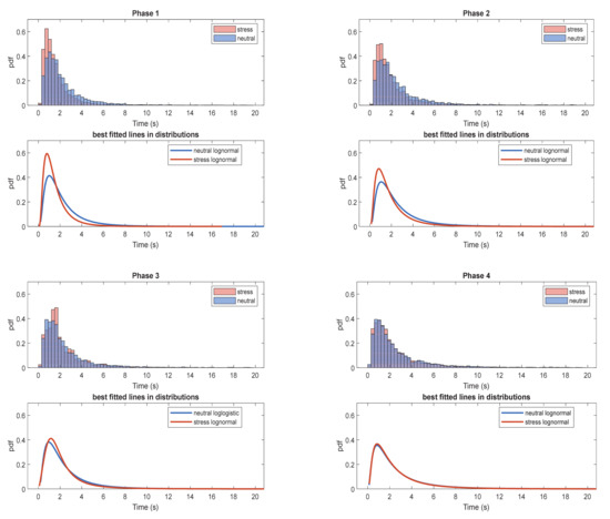 Normalized histograms of IBI for each experimental phase (phase 1–4) and induced affective state (neutral blue, stress red) and the corresponding best fitted distribution.