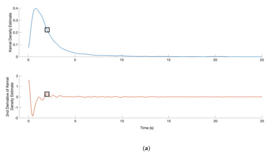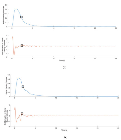 The blue line represents the kernel density estimator of the distribution of IBIs. The red line represents the second derivative of the kernel density estimator. The threshold for dividing the two states (short and long IBIs) is taken to be the IBI value (indicated by the square) that corresponds to the largest peak in the second derivative curve (indicated by square), which is to the right of the maximum of the kernel density curve. (a–c) correspond to the 1st, 2nd and 3rd experiment, respectively.