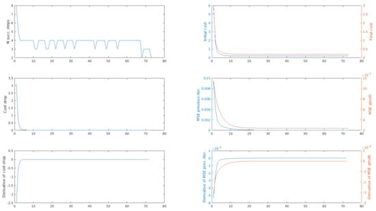 In Figure 2 we plotted the three termination criteria while aligning two point clouds from the Stanford Bunny dataset []. The starting transformation between the two clouds is a rotation of 45 around the vertical axis. On the x-axis we have the number of the iteration, while on the y-axis we can find—the number of successful steps of the “inner” optimization problem, the initial and final cost of the “inner” optimization problem, the cost drop (i.e., the difference between the two previous values), the Mean Squared Error w.r.t. the previous iteration, the Mean Squared Error w.r.t. the ground truth and the discrete derivatives of the last three variables. We plotted also the discrete derivatives because they clearly show when a variable is not changing anymore: when the derivative becomes zero, the value of a variable has stabilized.
