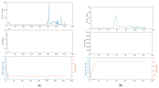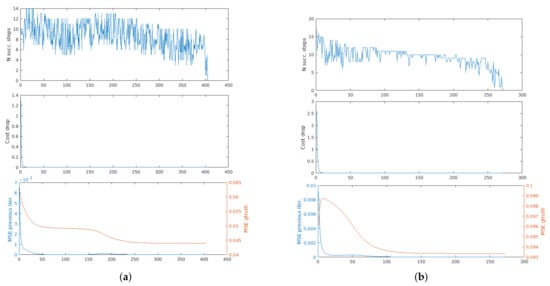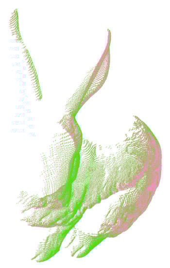In Figure 4a,b we show a pair of point clouds from the Bremen Dataset [], to which we applied, respectively, a small rotation and a small translation. The results obtained on these data are shown in Figure 5a,b. In these plots, and in the followings, we will not show the derivatives for space reasons. We can see that the cost drop stabilizes more or less when also the MSE w.r.t. the previous iteration stabilizes, that is, when the cloud has already been moved to the right solution (future adjustments are negligible compared to the resolution of the point cloud).