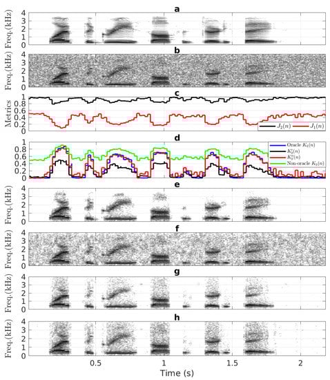 In the non-oracle case, the biased estimates of () and , resulted in (e.g., 0–0.15 s or 1.8–2.19 s in Figure 2e). According to Equation (21), this condition introduces around 0.5 bias in (e.g., 0–0.15 s or 1.8–2.19 s in Figure 2c). During speech presence of , it is observed that (e.g., 0.16–0.33 s or 0.9–1.06 s of Figure 2e), resulting in an underestimated as compared to the oracle case (Figure 2c). The 0.5 biased leaks 50% residual noise to particularly in silent regions (Figure 2h). Additionally, the underestimated in the speech regions introduce a significant distortion in the enhanced (Figure 2h). In addition, and metrics (Figure 2f) do not comply with the desired characteristics as found in WGN condition (Figure 1c). Therefore, it is inappropriate to apply and metrics in Figure 2f for tuning of the biased (Figure 2c) using Equations (31) and (32).