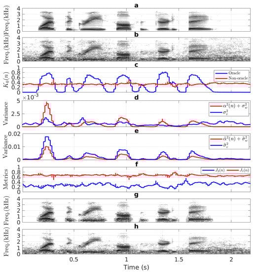 Review of existing KF-based SEA: (a,b) spectrograms of the clean speech (utterance sp05) and the noisy speech (corrupt (a) with 5 dB WGN), (c) and metrics, (d) oracle and non-oracle with adjusted and , spectrogram of enhanced speech produced by: (e) KF-oracle method, (f) KF-non-oracle method, (g,h) methods in [,].