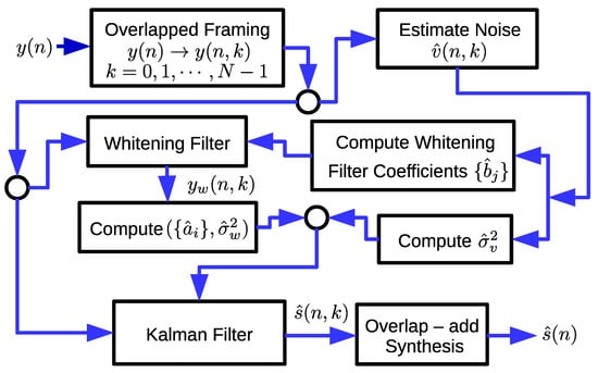 In the above Equations (7)–(11), and are the error covariance matrices of the a priori and a posteriori state estimates, and ; is the Kalman gain; is the variance of the additive noise, ; and is the identity matrix. During processing of each frame, the estimated LPC parameters, (, ), and noise variance, , remain unchanged for that frame, while , , and are continually updated on a sample-wise basis. As demonstrated in [,], the estimated speech at sample n is given by: . Once all noisy speech frames have been processed, synthesis of the enhanced frames yields the enhanced speech, .