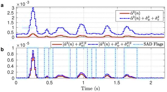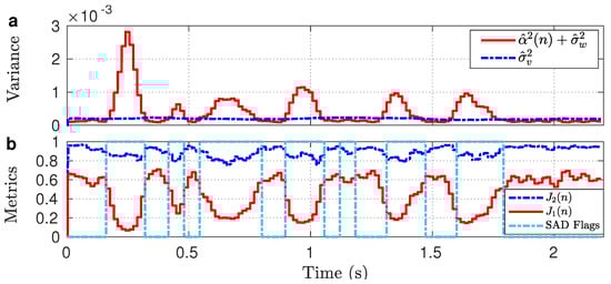 To justify the validity of , Figure 6a shows the numerator and the denominator of Equation (40) computed from the noisy speech in Figure 2b. It can be seen that during speech pauses (e.g., 0–0.15 s or 1.8–2.19 s of Figure 6a). According to Equation (40), . Since occurs during speech presence (e.g., 0.16–0.33 s or 0.9–1.06 s of Figure 6a), it may be underestimated as in the WGN experiment (Figure 1d). Thus, metric-based tuning of in speech activity of is inappropriate.