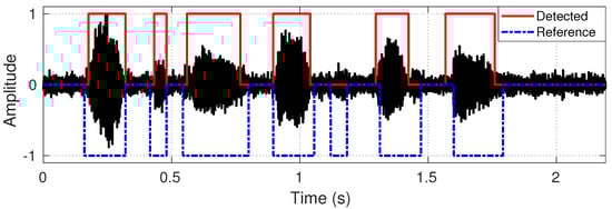 The proposed tuning algorithm requires a speech activity detector that operates on a sample-by-sample basis. However, the existing speech activity detector operates on a frame-by-frame basis. In addition, the incorporation of any external speech activity detector makes the proposed tuning algorithm a bit complex. To cope with the issues, we studied and found that the KF parameters can be adopted as a speech activity detector that operates on a sample-by-sample basis. Specifically, we found that and can be adopted as a speech activity detector for each sample of . For example, during speech pauses, the condition holds (e.g., 0–0.15 s or 1.8–2.19 s of Figure 4a. Conversely, is found in speech regions (e.g., 0.16–0.33 s or 0.9–1.06 s of Figure 4a). Therefore, at sample n, if , is termed as silent and set the decision parameter (denoted by ) as ; otherwise, speech activity occurs and . Figure 5 reveals that the detected flags (0/1: silent/speech) by the proposed method are closely similar to that of the reference (0/−1: silent/speech, generated by visually inspecting the utterance sp05).