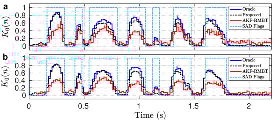 Comparing obtained using KF-pracle, proposed, and AKF-RMBT [] methods from the utterance sp05 corrupted with 5 dB: (a) non-stationary (babble) and (b) colored (f16) noises.