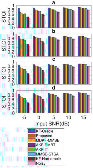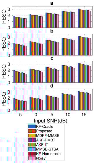 Figure 8 shows the average PESQ score (found over all frames for each test condition in Section 4.1) for each SEA. It can be seen that the KF-oracle method exhibits the highest PESQ score for all test conditions. It is due to (, ) and being computed from the clean speech and the noise signal. The improvement of the average PESQ score for the KF-non-oracle method is marginal as compared to the noisy one. The proposed SEA shows a considerable PESQ score improvement compared to the benchmark methods across the test conditions. The average PESQ score for the proposed method is also very similar to that of the KF-oracle method. It is due to the reduced-biased Kalman gain obtained by the proposed tuning algorithm being closely similar to that of the KF-oracle method (Figure 7). Amongst the benchmark methods, MDKF-MMSE [] shows relatively competitive PESQ scores followed by AKF-RMBT [] for all tested conditions (Figure 9a–d). On the other hand, the AKF-IT method [] exhibits reduced PESQ scores than other benchmark methods across the test conditions due to suffering from distortion and musical noise in the enhanced speech. In light of this comparative study, it is evident that the proposed method has better quality with regard to enhanced speech than that of the competing methods for all tested conditions.