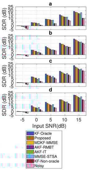 Figure 9 shows the average SDR (dB) score (found over all frames for each test condition in Section 4.1) for each SEA. Like the earlier experiment in Figure 8, the KF-oracle method shows an indication of the highest SDR score for all test conditions. Additionally, the noisy one shows the lower SDR scores for all tested conditions. The proposed SEA consistently demonstrates SDR score improvement from the competing methods across the test conditions. Amongst the competing methods, the MDKF-MMSE [] show relatively competitive SDR scores for all tested conditions (Figure 9a–d). The noisy one shows the lowest SDR scores for all tested conditions. In light of this comparative study, it is evident that the proposed SEA exhibits less distortion in the enhanced speech than that of the competing methods for all tested conditions.