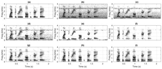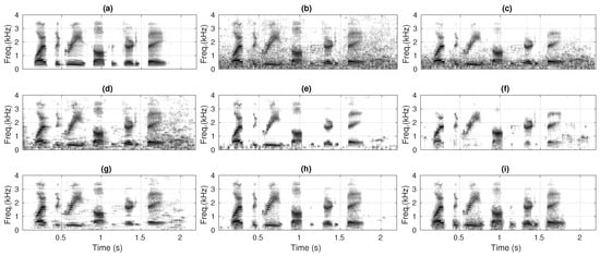 Comparing the spectrograms of: (a) clean speech (utterance sp05), (b) noisy speech (corrupt sp05 with 5 dB babble noise) (PESQ = 2.10), enhanced speech produced by the: (c) KF-non-oracle (PESQ = 2.18), (d) MMSE-STSA [] (PESQ = 2.32), (e) AKF-IT [] (PESQ = 2.26), (f) AKF-RMBT [] (PESQ = 2.42), (g) MDKF-MMSE (PESQ = 2.48), (h) proposed (PESQ = 2.55), and (i) KF-nracle (PESQ = 2.61) methods.