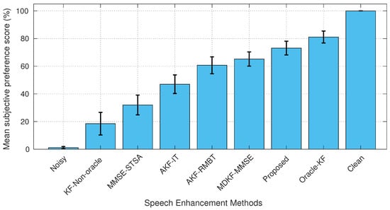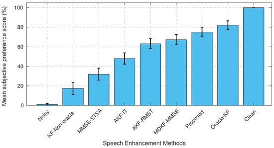 The mean preference score (%) comparisons for all methods are shown in Figure 13 and Figure 14. The non-stationary (babble) noise experiment in Figure 13 reveals that the proposed method is widely preferred (73%) by the listeners to that of the benchmark methods, apart from the clean speech (100 %) and the KF-oracle method (81%). Amongst the benchmark methods, MDKF-MMSE [] is most preferred (65%) with AKF-RMBT [] (60%). Although the AKF-IT [] produced distorted speech, as confirmed by objective PESQ, SDR, and STOI score comparison as well as spectrogram analysis, the listeners prefer it (47%) over MMSE-STSA [] (31%). The subjective testing implies that it was considered as an improvement of noise reduction in the speech region than a distortion. The colored (f16) noise experiment (Figure 14) also confirms that the proposed method achieves a significant preference score (75%) compared to the benchmark methods, excepting the clean speech (100%) and the KF-oracle method (82%). Among the benchmark methods, MDKF-MMSE [] is found to be the most preferred (67%) with AKF-RMBT [] (63%). In light of the blind AB listening tests, it is evident that the enhanced speech produced by the proposed method ensures the best perceived quality amongst all tested methods for both male and female utterances corrupted by real-life non-stationary as well as colored noises.