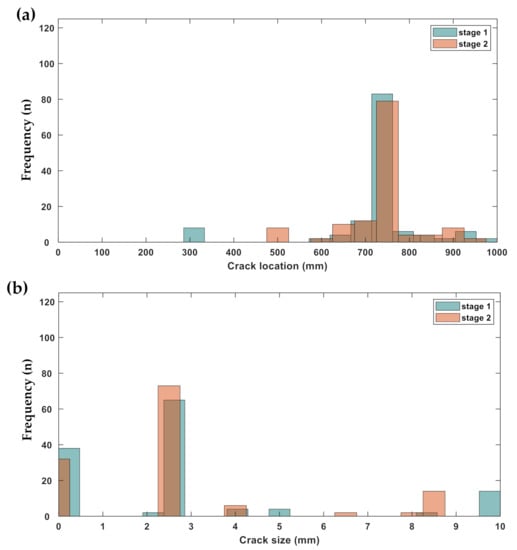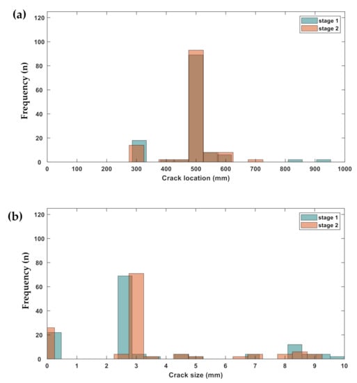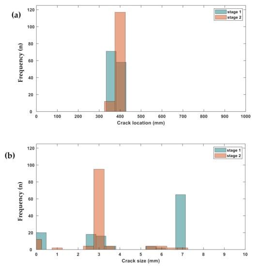 The frequency diagrams of crack size and crack location for two stages are plotted in Figure 4. The y-axis represents the number of occurrences, n. The frequency diagram of crack location suggests that the crack location is within ±40 mm range from 450 mm. In stage 1, however, the frequency diagram of crack size in Figure 4b indicates that there were three potential crack depths with average values of 0.5 mm, 3 mm, and 6.5 mm. The optimal range of crack size reported by the algorithm represents the occurrences falling within that range, making 6.5 mm a strong candidate in stage 1.