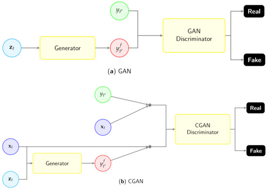 Schematic of (a) GAN and (b) CGAN models, showing Generator and Discriminator components and associated variables.