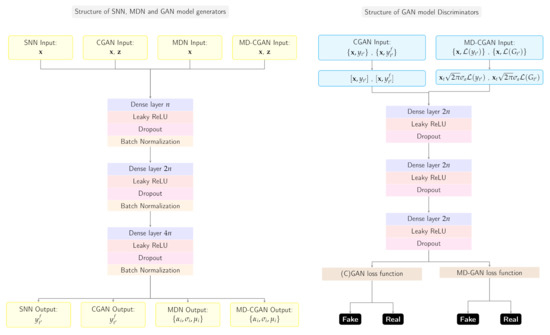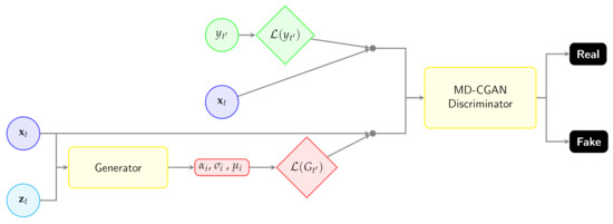 The neural networks in Figure 3 follow the structure of the CGAN model detailed in Reference [2]. The hyperparameters in the models were set as follows: for the discriminator, both in CGAN and MD-CGAN, the dropout parameter is set to 0.4, and alpha for the leaky ReLU is set to 0.2. For the generator, the dropout rate is set to 0.5, and alpha for the leaky ReLU is, again, 0.2. The parameter governing the number of neurons, n, in the dense layers of the neural network modules is set to 40. The variance parameter, , in the MD-CGAN models is set to 0.2. During training, we follow the steps of Algorithm 1 and set j to 1 for all datasets.