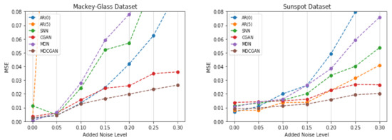 Mackey-Glass and Sunspot time series: We start our experiments looking at one-step ahead forecasts on two well known datasets, the Mackey-Glass chaotic time series [20] and the Sunspot dataset [21]. We consider one-step forecast errors in the presence of increasing test set noise. We add 5% to 30% (by amplitude) normally distributed noise to the test data (from a GAN perspective, these input perturbations are, in effect, treated similarly to adversarial attacks). However, a true adversarial attack has an intelligently chosen perturbation to maximize malicious impact. We note that no noise (perturbation) is added to the training dataset. Mean Square Errors (MSE) are presented in Table 1 and Table 2 and Figure 4 for all algorithms considered. For both datasets, we see that MD-CGAN has the best performance for noise levels of 10% and above. Indeed, we see that the GAN models (particularly MD-CGAN) perform consistently well (especially in the Mackey-Glass example) across multiple noise levels, indicating that the approach is particularly resilient to additive observation noise. This is to be expected, as GAN approaches treat the additive noise as adversarial perturbation to the input, against which they are designed to be robust.