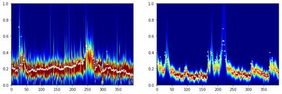 Estimated distributions for (left) Nat Gas with and (right) VIX index with over out-of-sample test datasets. True samples are shown as white dots. Red indicates high data likelihood, and blue data low likelihood, under the MD-CGAN model.