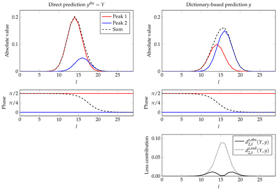 Figure 3. Example showing the interference of two overlapping peaks. Each peak models the contribution of one harmonic of a tone to the spectrum (cf. (8)). The left plots show a part of a direct prediction , which is assumed to equal the true spectrum Y for this example, and the right plots show a dictionary-based prediction y with deviating amplitudes. Due to the different amplitudes, also the phases mix differently, leading to a high value of . The phases could be optimized for y (by increasing the phase for peak 1 and/or peak 2), but this would lead to suboptimal phases in . In contrast, the used loss does not depend on the phase.