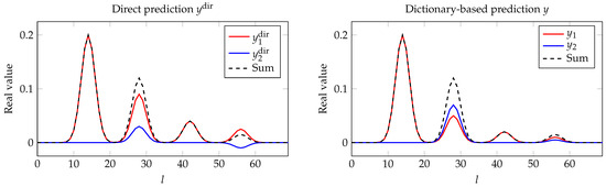 - If the discrepancy between y and is high and there is a lot of overlap between the peaks (typically from different tones), the optimal phase values for y and may be significantly different. An example for this is displayed in Figure 3: The two peaks (red and blue) each have different phases, but by design, those are identical between the predictions. However, since the dictionary prediction is less flexible, its amplitude magnitudes of the harmonics often do not accurately match the input spectrum Y, which shifts the phase in the overlapping region. Thus, attempting to minimize both and would lead to a conflict regarding the choice of common phase values.