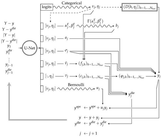 In practice, we first sample the stochastic parameters for the first tone, then obtain the deterministic parameters , and from these compute a model spectrum . For each additional tone , we gain and depending on the previous spectra , which encapsulate all the relevant information about the parameters of the previous tones.