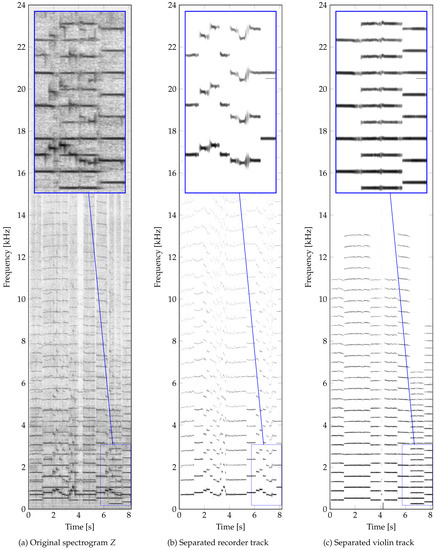 - Fitzgerald, D.; Cranitch, M.; Coyle, E. Shifted non-negative matrix factorisation for sound source separation. In Proceedings of the IEEE/SP 13th Workshop on Statistical Signal Processing, Bordeaux, France, 17–20 July 2005; pp. 1132–1137. [Google Scholar] [CrossRef] [Green Version]