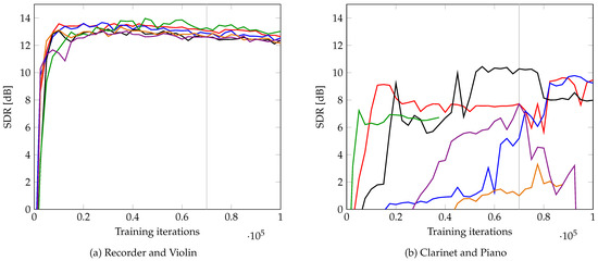 The functioning source code for the algorithm is available on GitHub (https://github.com/rgcda/Musisep, accessed on 6 September 2021) under the GNU General Public License (version 3). The input data from [18] can be downloaded from the respective website (https://sites.google.com/site/mperesult/musicseparationresults, accessed on 6 September 2021). For all the other samples, we provide the input data along with the best-case separation results on the institute website (https://www.math.colostate.edu/~king/software.html#Musisep, accessed on 6 September 2021). Due to the stochastic nature of parallel computing, training results are not exactly reproducible.