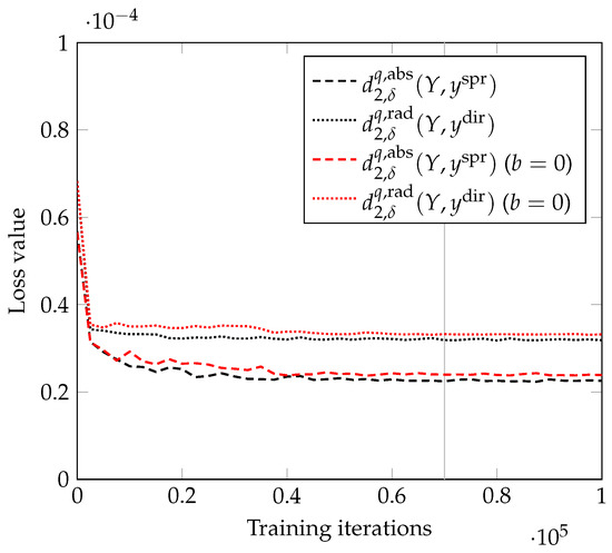 The q exponent has the purpose of lifting the low-volume parts of the representation in order to increase their relevance. The canonical choice is , since this is the lowest value to keep the expression convex in y. The value for can be low, as it is merely there to ensure differentiability at . Unlike the -divergence, the distance function in (12) is symmetric, but it is still not a metric in the mathematical sense.