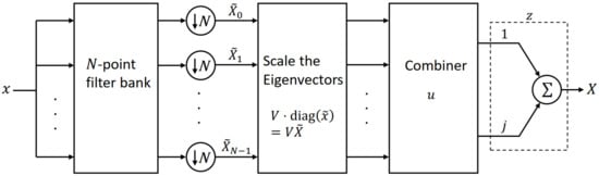 Now consider the matrix product . Each diagonal entry of scales the corresponding column of V, i.e., each eigenvector is scaled by the corresponding filter output. These scaled eigenvectors are then added or subtracted in the specific manner defined by u to give the real and imaginary components of the DFT result. This is why we call u the “combiner”. The combiner adds and subtracts the real parts (from the elements of u) and the imaginary components (from the of u). The vector z is only provided for theoretical completeness so that we can combine the real and imaginary components for the DFT X. These steps are summarized in Figure 1.