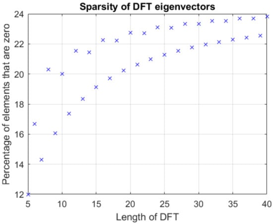 where the matrix represents the set of orthonormal eigenvectors corresponding to eigenvalues and represent the orthonormal eigenvectors corresponding to eigenvalues . The columns of these matrices represent the eigenvectors. The vectors in is even symmetric and the vectors in is odd symmetric. Additionally, if the size of DFT N is an even value, the th row of will be 0 to retain the odd symmetry. The sparsity of the eigenvectors are shown in Figure 2. From this plot, it is clear that the orthonormal DFT eigenvectors are somewhat sparse. This sparse nature can be exploited to reduce the number of operations required while computing the DFT as discussed in Section 7.