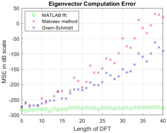 Figure 3 indicates the computational error due to imprecise DFT eigenvectors. Suppose x is a vector in and . The figure shows the mean squared error (MSE) of in decibels. The DFT and IDFT is calculated using Matveev eigenvectors, Gram–Schmidt orthonormalization of DFT projection matrices, and using the MATLAB fft() and ifft() functions. The MSE is calculated via (21), (22) and (23) where n is the length of the vectors x and y and the operator represents the 2-norm of x. The error shown in Figure 3 is caused by the limitation imposed by the machine that was used to compute the eigenvectors. More powerful machines can be used to pre-compute the eigenvectors to a high enough precision such that this error can be eliminated.
