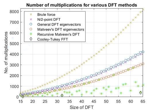 If the input is even or odd symmetric, the number of multiplications and additions can be further reduced. In contrast to (33) and (34), brute force computation of the DFT for a real input requires real multiplications and an equal number of additions. Thus, the method proposed here performs better when compared to the brute force DFT computation. Using the Matveev eigenvectors, our method also outshines the DFT calculated using the -point DFT. Moreover, unlike most FFT algorithms, our method does not require that N be highly composite. One can combine our approach with deconstructive algorithms like the Cooley–Tukey algorithm or the prime factor algorithm to yield efficient algorithms for computing the DFT of large sequences. This approach is certainly effective when the length N is not an integer power of 2. Figure 4 shows the number of multiplications required for computing the DFT using various methods.