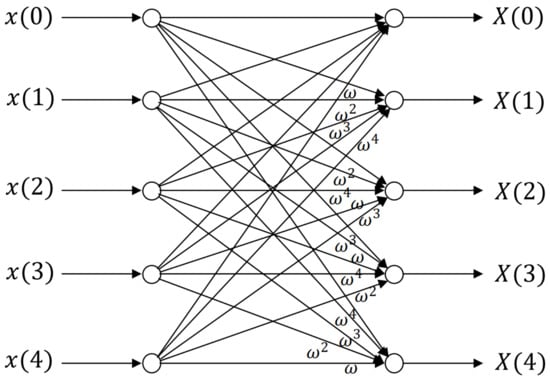 Unlike the 4-point DFT, computing the 5-point DFT requires multiplication with complex twiddle factors as shown in Figure 5. Our method performs better due to the lack of complex multiplications. Using our method for a 5-point DFT requires 20 multiplications and 24 additions from (33) and (34). On the other hand, the brute force, direct, method requires 41 multiplications and 36 additions.We chose the 5-point DFT butterfly because this is the smallest DFT that contains all the unique DFT eigenvalues, i.e., . In contrast, the eigenvalues of the 4-point DFT are .