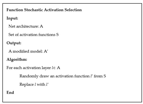 Given a neural network architecture and a pool of different activation functions, Stochastic Activation Selection consists in creating different versions of the same architecture that differ in the choice of the activation layers. This method was first introduced in [37]. The process to create a new network is based on the replacement of each activation layer (ReLU) by a new activation function which can be fixed a priori or randomly selected. This leads to a new network, which in the stochastic version, has different activation layers through the layers. Since this is a random procedure, it yields a different network every time. Hence, we iterate the process multiple times to create many different networks that we use to create an ensemble of neural networks. We train each network independently on the same set of data and then we merge their results using the average rule, which consists in averaging the softmax output of the networks in the ensemble. The pseudo-code of the procedures for stochastic activation selection is reported in Figure 1.