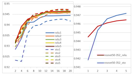 As a final experiment, we studied the performance of ensemble methods by varying the number of networks in the ensemble and the number of training epochs. For the sake of computation time, we considered only resnet50-352_relu vs. resnet50-352_sto, with the aim of studying the effects of stochastic activation selection in the design of ensembles. The graphs in Figure 2 report the performance obtained in the ECU testing set by ensembles of different sizes (each ensemble was obtained by adding a new network to the previous one, without any selection procedure). On the left, the performance of ensembles is reported as a function of the number of training epochs, and on the right, the performance at the final epoch is reported as a function of the number of networks. From both graphs, it is clear that even starting from a lower base performance (sto1 vs. relu1), the stochastic approach gains a higher advantage from the fusion. In the second graph, resnet50-352_sto outperforms resnet50-352_relu starting from Size 3.