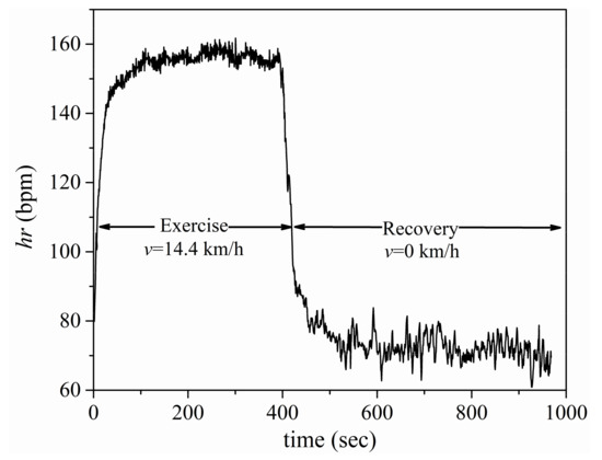 A healthy male (age 33, height 1.83 m and weight 82 kg) served as the test subject. His HR parameters were: hrmax = 185 beats per minute (bpm) and hrmin = 40 bpm; the former is defined as the highest HR value achieved in an all-out-effort to the point of exhaustion, whereas the latter refers to the HR at absolute rest [1]. The participant was a high-level professional runner, so he was able to keep the exercise intensity at constant levels and, thus, provide raw HR data of exceptional accuracy, as required by the study. He performed four running bouts of constant intensity exercise [9,10], ref. [18] followed by a passive recovery period, during which he laid horizontally and still on the floor. The experiment was carried out on a tartan track. Care was taken to ensure that the data recording environment was free of any additional electromagnetic signals, such as high-tension power lines, engines producing electromagnetic fields, or mobile phones.
