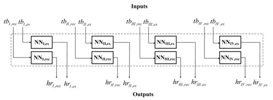 The block diagram of the NN model applied in this study is displayed in Figure 2. It consists of four pairs of NNs; each pair corresponds to an exercise set and its subsequent recovery at the specific velocity shown in the second column of Table 1. The NN architecture implemented for each block of Figure 2 is the MLP, which is a common choice for similar applications [16]. The input layer consists of one neuron, its input being the value of the beat-to-beat time interval, denoted as tbi, I = Iex, …, IVex or Irec, …, IVrec, whereas the output layer comprises a single neuron that sums the weighted outputs of the last hidden layer and produces the HR, i.e., hri. The specific structure of the MLP-NN applied for set (I)ex, i.e., for I = Iex, is shown in Figure 3; the circles denote the neurons in each layer.