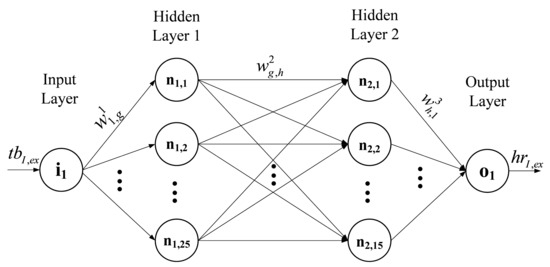 The appropriate number of hidden layers and the number of hidden neurons in each layer have been determined by applying a trial-and-error process. Both parameters are depicted in the second and third column of Table 2, respectively, for each exercise set. For example, the MLP-NN shown in Figure 3 consists of two hidden layers; the first one comprises 25 neurons, whereas the second one includes 15 hidden neurons. A logistic sigmoid activation function, given by , has been considered for all hidden layers, whereas a linear activation function has been selected for the neuron of the output layer [20,21,22,23,24]. The symbol (Figure 3) stands for the synaptic weight between the gth and the hth neuron, whereas the superscript j = 1, 2, 3 denotes the layer. The synaptic weights are adjustable parameters; at first, they are initialized and during training they are iteratively updated until the end of the training process. After training, their values remain constant [22,23,24].