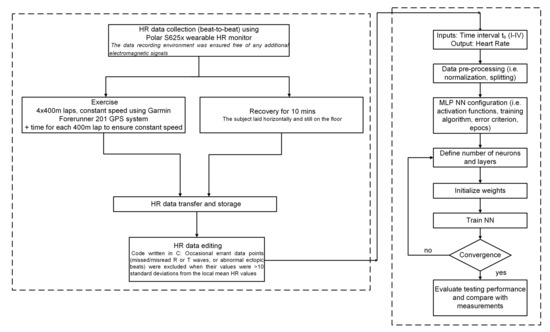 A synoptic view of the whole procedure followed in this work, from HR data collection to the performance evaluation of the NNs, is displayed in Figure 4. The block on the left-hand side of the chart, enclosed in the dashed contour, refers to the data collection and processing, whereas the dashed block to the right includes the design, training, testing, and performance evaluation of the NN model.