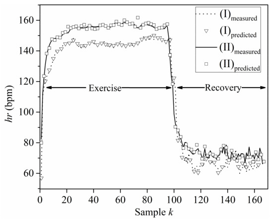 A comparison of the HR predicted from the NN models with measured HR time series data is presented in Figure 5, for the exercise and recovery periods of sets (I) and (II). It is readily apparent from Figure 5 that the proposed NN models are able to predict the HR accurately. Moreover, the familiar remark that the performance of the NNs is slightly better during the exercise than the recovery periods may be verified by the diagrams of Figure 5. Still, the overall performance of all NNs is of sufficient accuracy, since the does not exceed 10−3 for all cases examined, as indicated by Table 3.