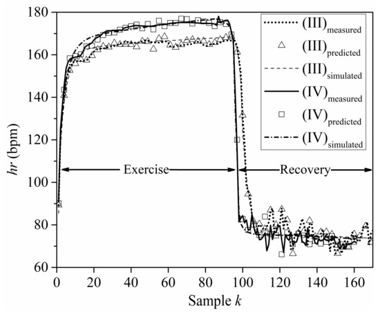 Figure 6 offers a comparison of results predicted by the proposed NN model (denoted as predicted hereafter) with the corresponding results produced by the mathematical model presented by Zakynthinaki [9,10] (denoted as simulated hereafter). The exercise and recovery periods of sets (III) and (IV) are considered, while the measured HR time series data (henceforth denoted as measured) are also included for reference. A careful examination of the results in Figure 6 leads to the conclusion that the NN model provides more accurate predictions than the mathematical model. This remark is more apparent from the plots for the recovery period, i.e., for k > 100; where the NN model is more efficient in capturing the frequent variations of the hr. It is worth mentioning that the dashed and dash-dotted lines in Figure 6 are representative examples of the HR values simulated by the dynamical systems model of Equation (3).