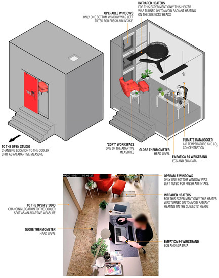 The experiment was carried out in an open plan studio space—Clima Lab. The Clima Lab is a 250 m2, free running space with a ceiling height of 7 m and a façade orientation to the south-east. While the Clima Lab is occasionally used as test space, it functions as a regular open space office containing several desks, a lounge area, a kitchen and a bathroom.