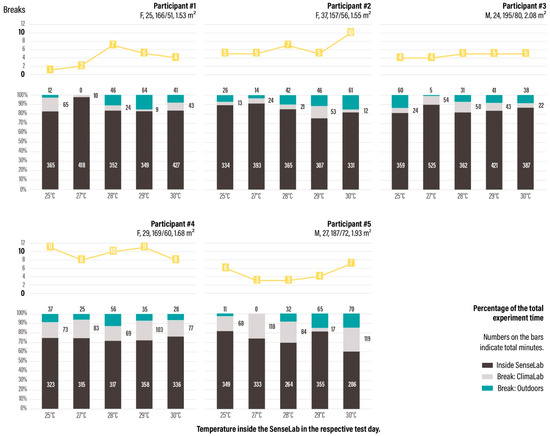As per the setup of the experiment, it was expected of the test subjects to use the change of space as the initial tool of adaptation. Figure 4 below show the total duration of work inside the climate chamber (Sense Lab), breaks in the cool room and breaks on the outside of the facilities.