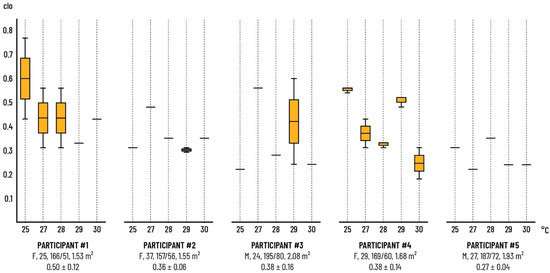 As for the other adaptive behaviour, change of the clothing was also constantly observed and marked. Figure 5 shows the variation of clothing values per participants, for each test day. Similar to the break pattern, there is no clear trend between the rise of the temperature and clothing decision. However, similar to the number of breaks taken during the day, the number of clothing changes presents a different characteristic behaviour for each participant.