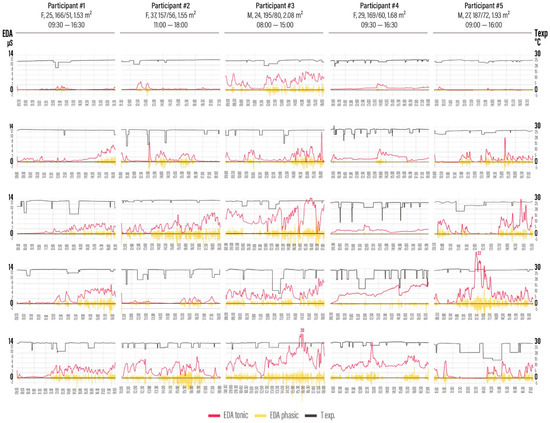 EDA tonic and phasic levels of each participant throughout the day. Each column represents different days (from top to bottom, 25 °C, 27 °C, 28 °C, 29 °C and 30 °C) for each Participant, respectively. The black lines show the temperature that the participant was exposed at the given time; i.e., one can assume that the higher temperatures are when they are in the Sense Lab, the lower ones are when they take a break in the cold room (Clima Lab) and the lowest ones are when they step outside. This also gives information about their break habits.