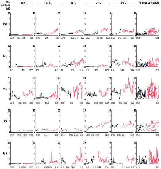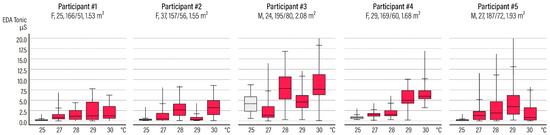 As mentioned previously, the main part of the data analyses focused on tonic component. The 25 °C day was accepted as the baseline for all participants. As expected, generally the EDA activity is at its minimum for all—however a comparison between Participant 3 and others clearly show the difficulty in making inter-person analysis with absolute numbers. As a clear example, while Participant 3 had a tonic range of 0—7.5 µS during the 25 °C day, this is the maximum range ever observed for Participant 1, including the 30 °C day (see Figure 7). This has been found previously in literature as “within-subjects correlations being much higher than those between-subjects” [36,37,48].