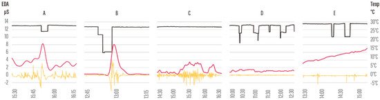 However, as the activities of different nervous systems are often overlapping in the domain of the same organ, the sweat secretion on the skin not only indicates SNS activity for thermoregulation but also might mean CNS dictated palmar, mental or emotional sweating [35,36]. A reliable distinction between the two is through the location of measurements in the body: palmar and plantar surfaces, foreheads or axillary and genital regions [37] are linked to psychological sweating response rather than evaporative cooling [38]. For this study, the EDA data is collected through the non-dominant hand’s wrist.