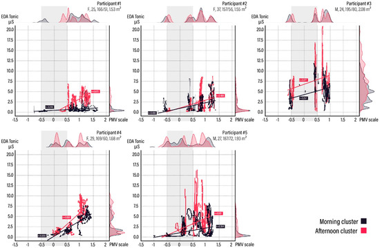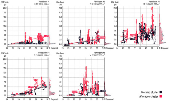 Scatter plots with temperature and SCL values illustrate the overall effect (Figure 11). The differences in morning and afternoon clusters are clearly visible in some participants (Participants 1 and 5), more moderate in some others (Participants 3 and 4), and an insignificant difference can be seen in one (Participant 2).