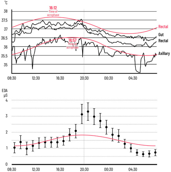 Up: Circadian oscillation of gut, rectal and axillary temperatures throughout the day. Composite of two separate studies. In black lines: Simultaneous gut, rectal and axillary temperatures in a 24 h hour cycle (after [57]). Data from 8 adult males. In pink lines: Cosinor analysis or rectal and axillary temperatures (after [58]). Data from two adult test groups with n = 19 and n = 74. Axillary line matches with the one from first study. Bottom: Graph shows the mean and standard errors while the pink line shows the best fitting 24-h pattern from non-linear mixed-effects model analysis, after [56]. In comparison to graph above, the acrophase for EDA seems to happen around 20.30, roughly 1–1.5 h after axillary acrophase.