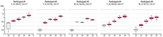 It can be observed from Figure 8, that tonic EDA presents a statistically significant increase after the 28 °C and above this temperature (i.e., 29 °C and 30 °C). Although there are several studies that compare EDA levels under different temperature settings, to the authors’ best knowledge, there are no comparable datasets that collected EDA data under the same temperatures and temperature steps. In the occupational health, psychophysiology or biomedical studies where the use of EDA has been traditionally more common, either the ambient temperature was kept to the thermoneutral ranges (22–26 °C depending on the study [37]) or where the impact of ambient temperature was studied, bigger steps of temperature changes were tested [50,51]. Therefore, the observed finding could not be compared to the existing literature. However, the clear difference of change in means from 27 °C to 28 °C will be observed with further data collection.